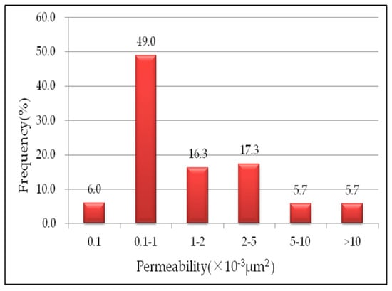 Figure 3 shows the distribution of the throat radius of 12 rock samples with different permeability in the closed coring well Well#1. The permeability range of the sample used for the experiment is in the range of 0.1–20 mD, which is representative and in line with the ultra-low-permeability characteristics of the study area. It is found that the throat radius is positively correlated with permeability. In Figure 3a, the throat radius of ultra-low-permeability samples (the sample’s permeability is at the level of less than 1 mD) is small (the average value is about 0.5 μm) and concentrated in a relatively narrow range (0.2~1 μm). In Figure 3b, the samples’ permeability is at the level of 1~2 mD, the average throat radius is about 1.0 μm, and the throat radius distribution range is 0.5~1.5 μm. In Figure 3c, the samples’ permeability is at the level of 2~5 mD, the average throat radius is 1.2 μm, and the throat radius distribution range is 0.5–2.0 μm. In Figure 3d, the samples’ permeability is at the level of 5~10 mD, the average throat radius is 1.4 μm, and the throat radius distribution range is 0.3–3.2 μm. In Figure 3e, the samples’ permeability is at the level of 10~20 mD, the average throat radius is 1.9 μm, and the throat radius distribution range is 0.3–4.0 μm. As the permeability increases, the average throat radius increases, and the throat radius distribution range is large, indicating that even for the layers with better permeability, the internal throat radius difference is large and the heterogeneity is still significant.