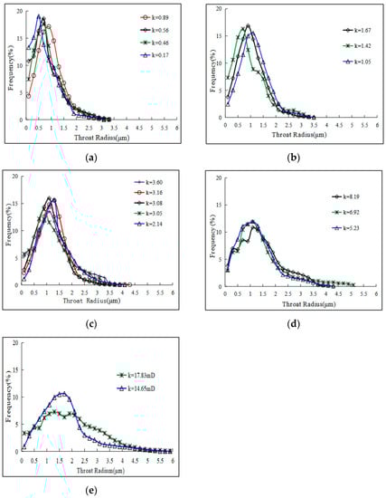 Distribution frequency of throat radius of samples with different permeability. (a) The permeability of samples is 0.1~1 mD; (b) the permeability of samples is 1~2 mD; (c) the permeability of samples is 2~5 mD; (d) the permeability of samples is 5~10 mD; (e) the permeability of samples is 10~20 mD.