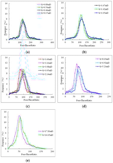 Distribution frequency of the pore–throat ratio of samples with different permeability. (a) The permeability of samples is 0.1~1 mD; (b) the permeability of samples is 1~2 mD; (c) the permeability of samples is 2~5 mD; (d) the permeability of samples is 5~10 mD; (e) the permeability of samples is 10~20 mD.