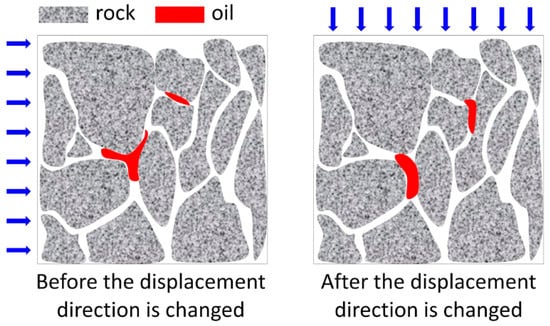 The mechanism of residual oil production by changing the displacement direction (blue arrow is displacement direction).