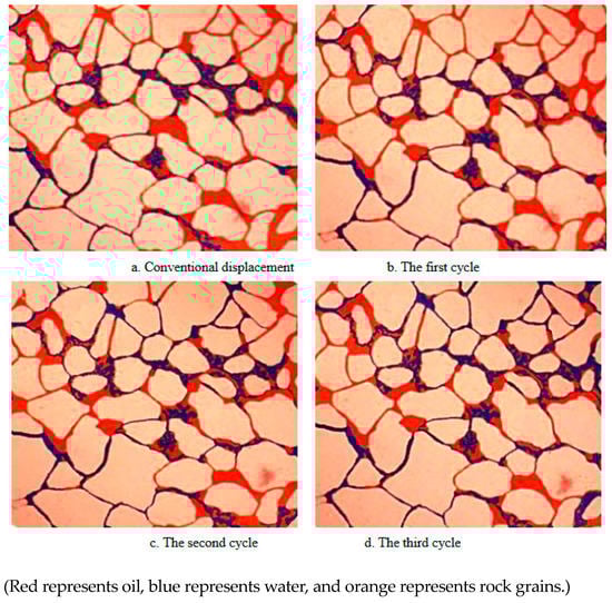 Figure 9 shows the microscopic residual oil distribution at each stage of periodic water injection of a sample with a permeability of 8.19 mD. It can be seen from the figure that as the number of injection cycles increases, the oil displacement efficiency gradually increases, and the columnar residual oil that is exchanged with water flows to the pores with a high water content under the action of capillary force. When the injection is stopped, the columnar residual oil flows out of the throat under the action of capillary force and enters the main channel. The position of the oil and water changes and the movable oil ratio increases. Table 3 shows the saturation of various residual oil types, total residual oil saturation, and oil displacement efficiency at each stage after the water injection of three samples. The remarkable effect of periodic water injection can be seen. For the three samples after the three cycles of injection, the oil displacement efficiency is 38.75%, 44.65%, and 49.34%, respectively. Compared with conventional water flooding, the oil displacement efficiency is increased by +7.5%, +5.83%, and +5.67%. The total residual oil saturation is 4.65%, 3.79%, and 3.86% lower than that of conventional water flooding. The saturation of the clustered residual oil and the columnar residual oil were reduced by (2.44%,1.08%), (2.22%,0.91%), and (2.84%,0.45%), respectively. Therefore, the residual oil could be effectively produced.