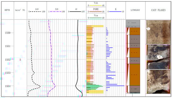 Comprehensive histogram of Well#1. From the left track to the right track: the first track is the well’s depth, in m; the second track is the layer’s NO; the third track is the deep lateral resistivity log, LLD, Ω m; the fourth track is the induction resistivity log, ILD, Ω m; the fifth is the acoustic log, AC, us/m; the sixth track is shale content Vsh, %, porosity PORE, %, and calcium content, Vca, %; the seventh track is permeability, k, mD; the eighth track is the lithology profile; and the last track is cast pictures.