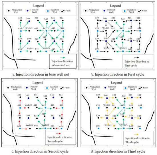 Table 4 shows the direction of the water injection of the oil well in Figure 13. In the table, ‘S’, ‘N’, ‘E’, and ‘W’ are used to represent the injection water from the south, north, east, and west, respectively. The ‘S-E’, ‘N-W’, ‘S-W’ and ‘E-N’ represent that the injected water comes from the southeast, northwest, southwest, and northeast, respectively. ‘+’ represents the coexistence of several directions. Taking Well#1 and Well#2 as an example, from the basic well pattern to the first, second, and third cycles, the direction change of water injection source of #1 is as follows: west (basic well pattern) → west + north (first cycle) → west (second cycle) → north (third cycle); the direction change of the water injection source of Well#2 is as follows: N (basic well pattern) → W + N + S (cycle 1) → W (cycle 2) → N + S (cycle 3).