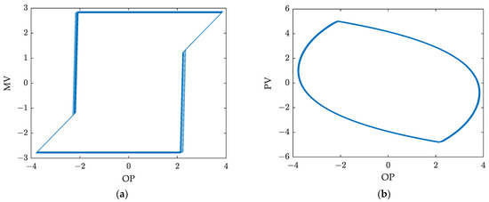 Figure 4 shows OP-MV and OP-PV plots with a sticky control valve. From Figure 4a, it can be seen that, affected by the static friction of the valve, the OP-MV plot presents a limit cycle shape instead of a linear relationship in the normal state. Similarly, OP-PV in Figure 4b is also a limit cycle shape. Since the variable MV in most actual control loops is difficult to measure [34], the proposed method uses OP and PV data to detect valve static friction, which is more practical. Figure 5 shows the OP and PV curves with a sticky control valve, taken from a simple numerical simulation example. The X-axis represents the oscillation magnitude of OP and PV with respect to the steady-state point of the system, and the Y-axis is the number of samples in time order.