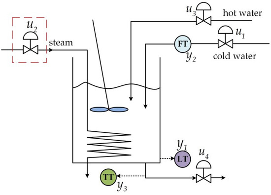 The CSTH benchmark process is a heat exchanger system commonly applied in chemical process fault diagnosis [46,47,48] and safety analysis [49]. Its dynamic model describes the behavior of the CSTH system in terms of fluid flow, heat transfer, and temperature dynamics. Thornhill et al. employ a combination of measured data extracted from a process and a physical mechanism model, developing a hybrid model [45]. It incorporates the detailed characterization of valves, sensors, and the heat exchanger, resulting in more sophisticated and realistic features. Refer to Figure 8 for its structural representation. In the experiment, u1 and u2 were treated as manipulated variables, while y1 and y3 were considered as controlled variables. Specifically, y1 was controlled by u1, while y3 was controlled by u2.