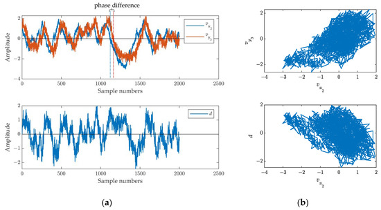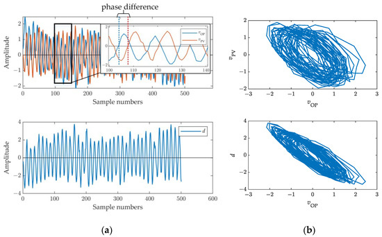 The oscillation curves and limit cycle plots with the valve stiction parameter S = 1, J = 0.5 are shown in Figure 9. From the curves in Figure 9a, we find that both and oscillate, but the oscillations are not periodic and have a certain randomness. There is also a phase difference between the two. Hence, the signal d also exhibits irregular oscillation. In Figure 9b, the limit cycle shapes, plotted by - and -d, also display irregular patterns, indicating the presence of nonlinearity.