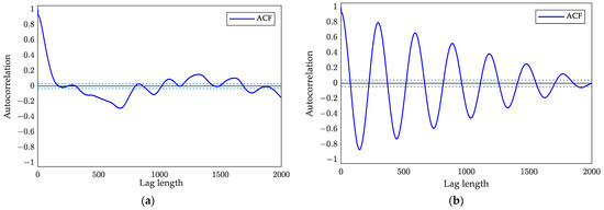 The detection results under different valve stiction parameters are presented in Table 5. It can be noted that the Hs indices were below 0.5 for all five cases, indicating the presence of valve stiction. However, the R indices were less than 1, indicating that no oscillations were detected and these results were failures. Figure 10 provides the ACF curves of the system output when the parameters S = 1, J = 0.5 in Scenario two, and the parameters S = 2, J = 1 in Scenario one. Compared with the ACF in Scenario one shown in Figure 10b, the intervals between the ACF zero-crossing points of the irregular oscillation time series also have a certain degree of randomness, as shown in Figure 10a. This is the reason for the detection failure of the R index. Meanwhile, the proposed method calculated the long-term correlation over the entire sample data range, and therefore accurately detected this irregular oscillation signal, i.e., the valve stiction was successfully detected. According to the experimental results mentioned above, the proposed method had better detection performance when valve stiction led to irregular oscillation.