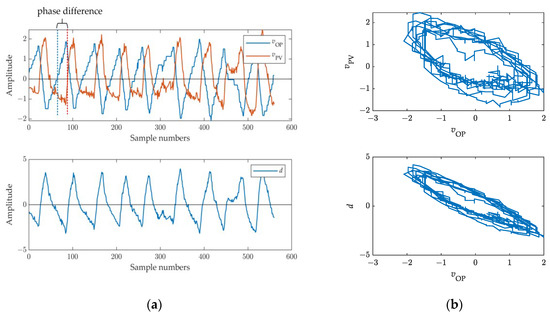 Figure 7 shows the oscillation curves and limit cycle plots with the valve stiction parameter S = 2, J = 1. It can be seen from the curves in Figure 7a that both and exhibit a periodic oscillation trend, and there is a phase gap between them, so their difference signal d presents a periodic oscillation. From the plots in Figure 7b, -d and - are both limit cycle shapes, which shows the presence of nonlinearity between and d, just like that between and .