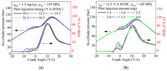 As can be seen from Figure 4a, the HRR phase in the pilot injection stage changes obviously, while the pmax and HRRmax in the main injection stage show little difference. However, when the pilot injection timing is 10.3 °CA BTDC, it is too close to the TDC, which makes the interval between the pilot injection and the main injection too short, and the boundary between the combustion stage is not obvious. The PRRmax of the main combustion stage is too high, resulting in rough engine operation and the inability to achieve low-temperature combustion. It can be seen from Figure 4b that the HRRmax value of the pilot injection stage is located near 3 °CA BTDC. With the increase in the pilot injection amount, the HRRmax of the pilot injection stage increases and the heat release amount of the main injection stage reduces. In addition, the pmax increases gradually with the increase in the pilot injection amount. This is because with the increase in pilot injection amount, the amount of energy used to ignite the in-cylinder ethanol homogeneous mixture increases, causing more pre-mixed F-T diesel fuel to be ignited.