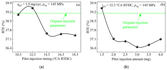 As can be seen from Figure 7a, the BTE of the engine firstly increases and then decreases with the increase in the pilot injection timing, and reaches a maximum value at 12.3 °CA BTDC. Compared with the original parameters, with the increase in the pilot injection timing, the temperature in the cylinder at tpil decreases, and the BSFC of ethanol significantly increases although the ESR is constant, which leads to the BTE decreasing obviously. It can be seen from Figure 7b that compared with the original engine parameters, the BTE decreased significantly with the increase in the pilot injection amount. Similarly, as can be seen from Figure 6b, the BSFC of ethanol increases significantly with the increase in the pilot injection amount. In this case, the lower temperature in the cylinder may lead to a more incomplete combustion of F-T diesel fuel, resulting in a decrease in the final thermal efficiency.