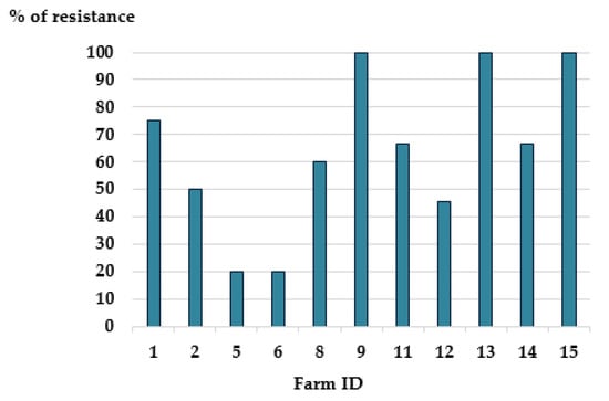 The results of inoculation of selective MacConkey agar with Cefotaxime showed the presence of 39 (24.52%) presumptive ESBL/AmpC producing strains of E. coli, which belonged to 11 (32.3%) farms. As for the presence of carbapenemases-producing strains, tested on a bi-plate selective chromogenic medium, none of the 34 farms were isolated. The resistance percentage on farms where presumptive ESBL/AmpC producing strains of E. coli were confirmed ranged from 20% to 100% (Figure 1). On more than half of the farms, the percentage of presumed ESBL/AmpC producing E. coli strains varied between 45% and 60%.