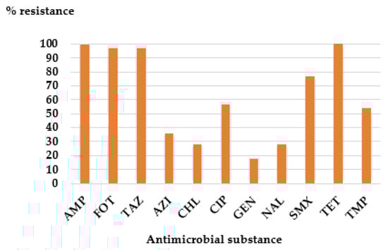 A MIC of 16 mg/L was considered aa a reference for azithromycin resistance in wild-type isolates (no cutoff was set by EUCAST), as proposed for Salmonella spp. [,]. In this context, the phrases “susceptible” and “resistant” refer to isolates that lack (wild type) and have phenotypically expressed resistance mechanisms, respectively. In conclusion, an ESBL phenotype was determined if isolates were resistant to FOT (>1 mg/L) or TAZ (>1 mg/L) but susceptible to FOX (8 mg/L) and demonstrated clavulanic acid synergy with FOT and/or TAZ (more than a 2-fold reduction in the MIC combined with 4 mg/L CLV compared to the MIC of the cephalosporin alone). If there was no clavulanic acid synergy and the isolates were resistant to FOT or TAZ (>1 mg/L) and FOX (>8 mg/L), they were categorized as having the AmpC phenotype. If isolates were resistant to FOT (1 mg/L) or TAZ (>1 mg/L), resistant to FOX (>8 mg/L) and demonstrated clavulanic acid synergy with FOT and/or TAZ, an ESBL/AmpC phenotype was assigned. Meropenem resistance (>0.12 mg/L) was used to infer a carbapenemase-producing phenotype.