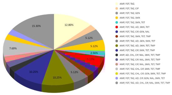AMP-FOT-TAZ is the most prevalent antimicrobial agent combination, present in almost all isolates (97.4%), followed by AMP-SMX, which appears in 30 (77%) of the isolates.
