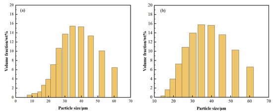 Particle size distribution of the mixed powders: (a) EMP; (b) AMP.