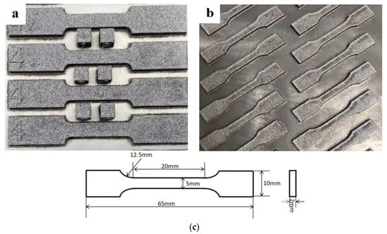 The SLMed samples prepared by: (a) EMP and (b) AMP; (c) Schematic diagram of tensile specimen dimensions.