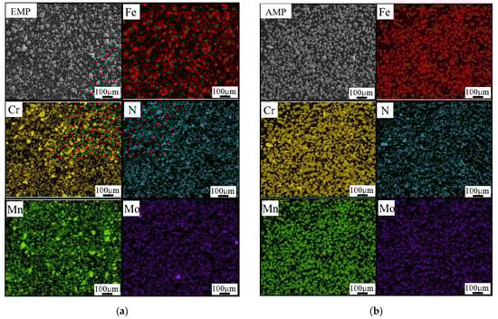In Figure 3, the two powders’ morphologies and elemental distributions are depicted. The results demonstrate that the sphericity of the EMP was poor, and there were numerous nonspherical powder particles, while there was only a very small amount of nonspherical powder in the AMP. There was a small amount of aggregation in the elemental distribution of the EMP, while the elemental energy spectrum scanning results of the AMP were more uniform. This might be a result of the alloy mixed powder having greater flowability, apparent density, and compacted density due to the use of more irregular powders, specifically CrN and Mn, which accounted for up to 22% of the total, and which have uneven particle sizes distributed throughout, as shown in Table 2.