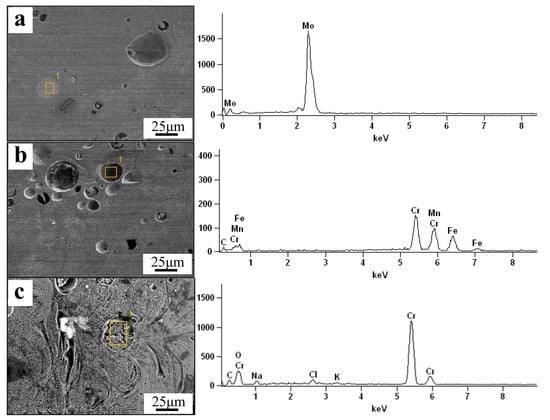 Composition analysis of the samples prepared with EMP: (a) unmelted particles of Mo; (b) unmelted particles of Fe, Cr, and Mn compounds; (c) unmelted particles of Cr.