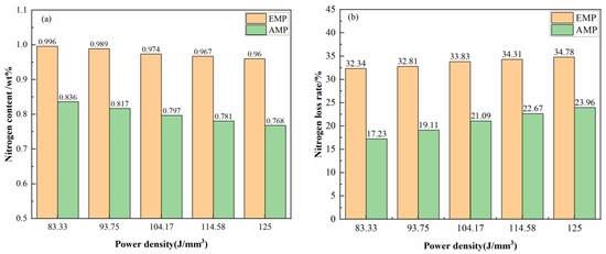 Comparison of nitrogen content of the formed samples under different energy densities: (a) Nitrogen content and (b) Nitrogen loss rate.