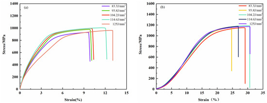 Typical stress–strain curves under different energy density conditions: (a) sample formed from EMP and (b) sample formed from AMP.