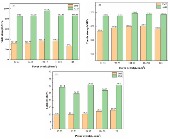 The mechanical properties of the EMP and AMP samples were examined under various energy density conditions. The typical tensile curves are displayed in Figure 8. The results show that the AMP samples had mechanical properties (yield strength, tensile strength, and elongation) superior to those of the EMP samples. The equivalent comparison of yield strength and tensile strength is shown in Figure 9. When the energy density was 114.6 J/mm3, the EMP samples had the highest ultimate tensile strength, at 1005.74 MPa; when the energy density was 105 J/mm3, the AMP samples had the highest ultimate tensile strength, at 1189.2 MPa. As the energy density increased, the tensile strength of the two samples first increased and then decreased. At each energy density, the strength of the AMP samples was greater than that of the EMP samples. The equivalent elongation comparison is shown in Figure 10. The EMP samples had the greatest elongation, 13.07%, at the energy density of 300 W. The elongation of the AMP samples was above 24%, which was much better than that of the EMP samples.