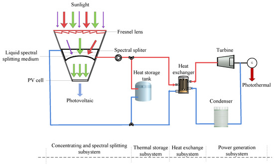 The system splits the solar spectrum energy via the concentrating and spectrum-splitting subsystem. The Fresnel lens concentrator, a hollow concave cavity splitter, which concentrates the PV cell and spectrum splitting medium, was designed according to the sunlight energy variation characteristics of the concentrator and spectrum splitter.