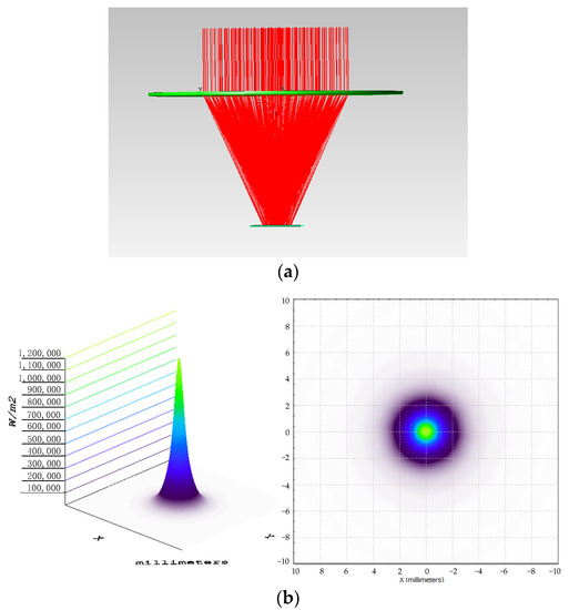 Fresnel lens ray-tracing simulation. (a) Optical path when sunlight is incident vertically on a Fresnel lens. (b) Fresnel lens spot after concentrating.