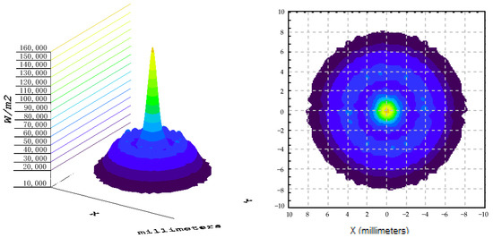 After setting the concave cavity to homogenize the light, the spot is distributed in a series of concentric rings. The maximum energy density is located on the ring with a radius of 1 mm, and a band width of 0.5 mm, and the maximum energy flow density is 1.5629 × 105 W/m2. The energy flow density of the rest of the ring bands is close to the average value of 17,806 W/m2. The uniformity of the energy flow density is improved by 17% when compared to direct concentration.