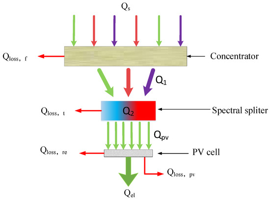 The solar radiation Qs concentrates and irradiates via the spectral splitter through the Fresnel lens, and some solar light is absorbed by the spectral-splitting medium and is converted into thermal energy Q2. The rest of the solar radiation Qpv is transmitted through the spectral splitter to reach the PV cell. In the process of absorbing heat, a small amount of thermal energy Qloss,t is lost to the environment in the form of radiation. The energy radiated to the surface of the photovoltaic cell is Qpv.