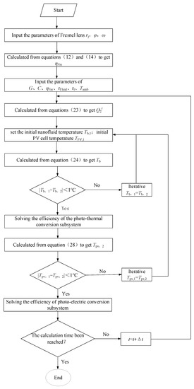 The mathematical model of the system was established by synthesizing Equations (13)–(32), and the system was simulated using Matlab. When calculating the temperature of the photovoltaic cell nanofluid, we set the calculation accuracy of the photovoltaic cell and nanofluid to 1 °C as the convergence principle. Based on the above steps, the system model calculation process is shown in Figure 11.