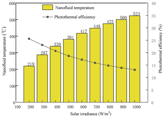 It can be seen that the maximum conversion efficiency of the photothermal conversion subsystem is 25.6%. With an increase in solar radiation, the efficiency of the photothermal conversion decreases gradually. This is because the heat dissipated into the air by the nanofluid gradually increases with the rise in nanofluid temperature, which makes the photothermal conversion efficiency decrease. The nanofluid temperature gradually rises with the increase in solar irradiance, reaching a maximum of 523 °C at 1000 W/m2.
