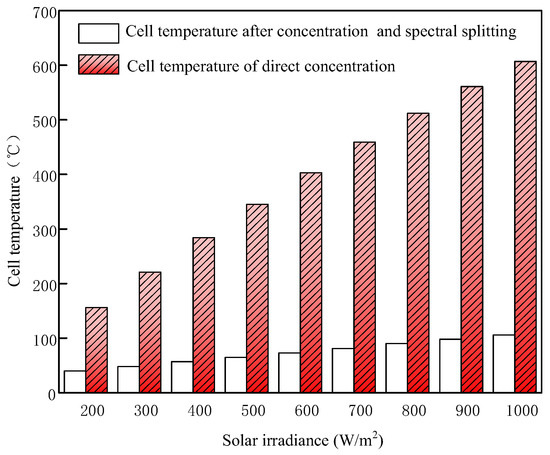 Figure 13 shows that when the concentration ratio is 50 times, the temperature of the GaAs cells will increase with enhanced solar irradiance. When solar irradiance is 1000 W/m2, the temperature of the cells rises to 607 °C, which greatly affects conversion efficiency and even burns the cell. The nanofluid in the splitter absorbs most of the infrared light energy from solar radiation, making the temperature of the cell only slightly increase with solar irradiance. When solar irradiance is 1000 W/m2, the temperature of the cell is 106 °C, and it can still work normally. It can be seen from the comparison that under concentrated light, the splitter can significantly reduce the temperature of the cell.