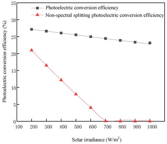 As can be seen in Figure 14, the photovoltaic cells are affected by temperature coefficients, and the efficiency without spectral-splitting cells will be greatly reduced. When spectral splitting to make the temperature of the concentrated photovoltaic cells greatly reduced, the photoelectric conversion efficiency is at least 7% higher than the efficiency of nonspectral-splitting cells. When solar irradiance is greater than 600 W/m2, the photoelectric conversion efficiency of the photovoltaic cell without spectral splitting is almost reduced to 0 due to the high temperature, while the photoelectric conversion efficiency of the cells only decreases by 4.35% after spectral splitting. The photovoltaic efficiency of direct concentration systems decreases significantly when solar irradiance increases. Through spectral splitting, it is possible to obtain higher photovoltaic efficiency while increasing the concentration ratio of the system.
