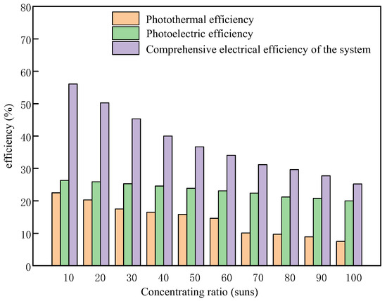 Figure 15 shows that with an increase in concentration ratio, the photoelectric conversion and the photothermal conversion efficiency of the system will decrease. The reason for this is that when the Fresnel lens with a higher concentration ratio is used, the amount of thermal radiation to the PV cell will also increase, which will lead to a decrease in photoelectric conversion efficiency. At the same time, more solar radiation will be absorbed by the nanofluid and will be converted into thermal energy. As the temperature of the nanofluid increases, the heat loss of the nanofluid increases, leading to a decrease in the average thermal efficiency of the system, which, in turn, leads to a corresponding decrease in the overall efficiency. However, the value of the concentration ratio still needs to be considered in conjunction with the actual required thermal fluid temperature (not the lower, the better).