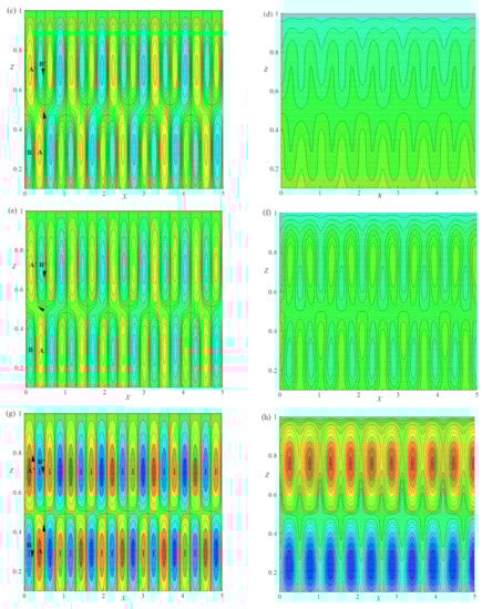Figure 6d, which exhibit the mode of convective heat transport inside the fluid layer. In the fluid layer, the absolute maximum and minimum values of isotherms are respectively,