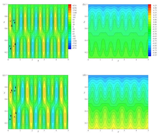 Figure 7a–d, illustrate the streamlines and isotherms for different values of