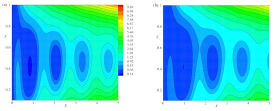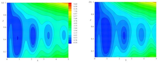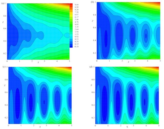 , respectively. Accordingly, the isotherm curves develop more deformation. The absolute maximum and minimum values of isotherms in the layer are, respectively,