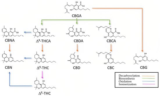 | Cannabinoids | CBN | THCA | ∆9-THC | CBG | CBDA | CBD |