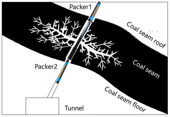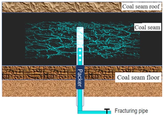 (1) A single packer was used to lower the packer to the coal–rock interface, and the packer was inflated and set by high pressure water. The high-pressure water entered the borehole cavity through the screen tube to fracturing the coal seam. This process has the characteristics of short depth under packer and high construction efficiency. The disadvantage is that the sealing in soft coal is not reliable, the high-pressure water forms one-way thrust on the packer, and the tool string is easily affected by high-pressure water extrusion and external impact. See Figure 8 for the schematic diagram of the process.