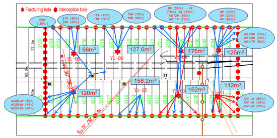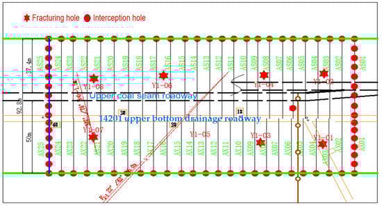 Intercepting boreholes are arranged at the strike and dip boundary of the control area of the test area, and the spacing between the intercepting boreholes and the adjacent fracturing holes is 20–30 m. The spacing of intercepting boreholes is 8–16 m. There are 78 intercepting boreholes designed and constructed 189 m in front of 14201 working surface upper and lower roadway pumping strip area.