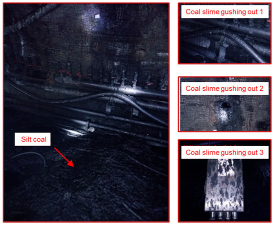 The video monitor verifies that a large amount of slime is ejected from the intercepting hole, indicating that the hydraulic fracture extends from the fracturing hole to the pressure relief intercepting hole. After the black water and slime are discharged from the intercepting hole near the fracturing hole, the orifice valve of the intercepting hole was closed, so that the high-pressure water-induced crack continued to expand in the direction of other intercepting holes. See Figure 16 for the coal slurry emission from the intercepting hole.