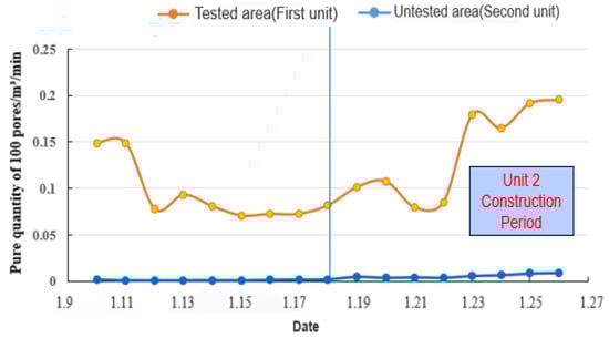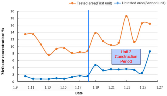 The test area was the first extraction unit, with the maximum gas content of 8.89 m3/t, which was fractured and punched. The second extraction unit was the area to be fractured. The strike and dip boundaries of the strip control area were equipped with intercepting boreholes, and the spacing between the intercepting boreholes and the adjacent pressure holes was 20–30 m. The interception hole spacing was 8–16 m, and the maximum gas content was 8.09 m3/t. The data of orifice pumping in the two units from 10 January to 26 January 2022 were calculated. The average concentration of boreholes in the first extraction unit was 4.8 times that of the second extraction unit, as shown in Figure 19. The average 100-hole pure volume in the fractured area was 42 times that in the unfractured area. See Figure 20. The fracturing of the second unit started on 17 January 2022. As can be seen from Figure 19 and Figure 20, the concentration and purity of the two extraction units increased significantly during the second unit fracturing due to fracturing disturbances.