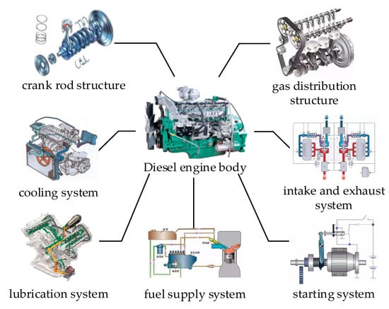 As the power system of self-propelled artillery, tanks, armored vehicles, and other weapons and equipment in the army’s active equipment, diesel engines have the advantages of high torque and good economic performance. However, due to its complex structure and harsh working environment, reliability and safety gradually decrease with the increase in running time. If the failure of the diesel engine cannot be found in time to assess its health status, it will affect the performance of the equipment and even cause serious economic losses and safety accidents. According to statistics, in tank failure accidents, mechanical failure accounted for 35%, of which 48% were caused by diesel engine failure [1]. Currently, breakdown maintenance and cyclical preventive maintenance are the main means of maintenance support after a diesel engine failure, but these methods require professional maintenance personnel to carry out manual fault diagnosis, which is time-consuming. In addition, as a complex reciprocating machine, the diesel engine has multiple stages of health status, from normal operation to downtime, so how to effectively characterize and evaluate the different health status of the diesel engine during operation is a key issue that needs to be addressed in the actual maintenance support process of the diesel engine [2].