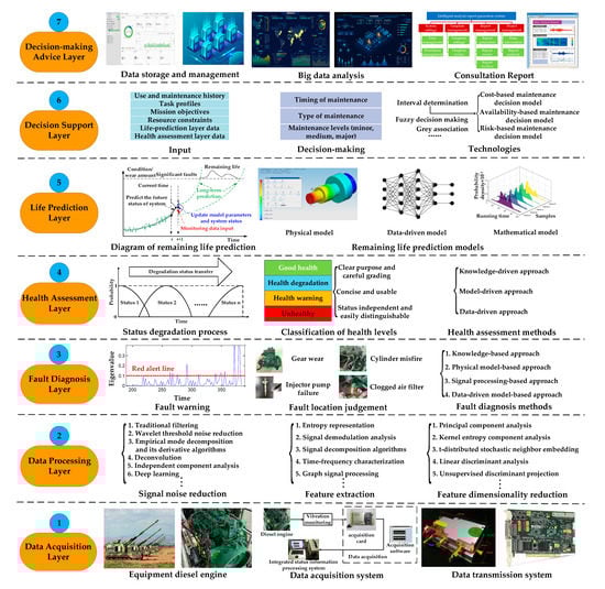As can be seen from Figure 2, the PHM architecture for diesel engine equipment mainly consists of a data acquisition layer, a data processing layer, a fault diagnosis layer, a health assessment layer, a life prediction layer, a decision support layer, and a decision-making advice layer. Firstly, data reflecting the operating status of the diesel engine, such as vibration, sound, infrared thermal images, oil, etc., is collected through the data acquisition system. However, due to the complex operating environment of diesel engines and the interference of various components with each other, the data collected through sensors is inevitably of poor quality. Therefore, effective data processing methods are needed to guarantee data quality, including signal noise reduction, fault feature extraction, feature dimensionality reduction, etc. Secondly, the processed data can be fed into the fault diagnosis layer to correctly indicate fault location on the one hand, and the extracted feature parameters can be used in the health assessment layer to realize the classification of health classes and identification of degradation status of the diesel engine, as well as in the life prediction layer to predict the location, time, and remaining life of the diesel engine when a fault occurs. Finally, the fault diagnosis results, degradation status identification results, health status assessment results, remaining life prediction results, and maintenance support resources are comprehensively analyzed, and the decision support layer and decision-making advice layer are used to formulate the maintenance support plan for the diesel engine according to the maintenance tasks and give maintenance recommendations.
