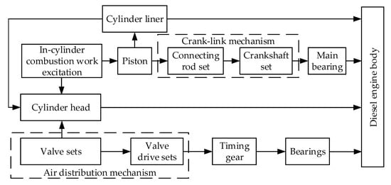 Diesel engines have a complex working environment (affected by high temperature, high pressure, and a harsh environment), and the whole engine body will vibrate under the combined force of various components during the working process. The path of the diesel engine vibration excitation is shown in Figure 3. The vibration signal is easy to collect, simple, and feasible without disassembling the body of the diesel engine, etc. It can quickly reflect the health status of the equipment and is suitable for online or offline condition monitoring. The installation position of the vibration sensors (#1 to #6) when collecting the diesel engine vibration signal is shown in Figure 4. Therefore, the vibration signal-based diesel engine condition monitoring data acquisition method has become a hot spot for research. Jiang et al. [4] proposed a diesel engine valve clearance fault diagnosis method based on the Teager energy operator (TEO) gradient neighborhood vibration shock start point adaptive accurate extraction. Cai et al. [5] discussed a fault identification method for visualizing diesel engine vibration signals based on an improved local binary model with two-way two-dimensional principal component analysis.