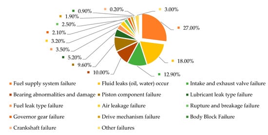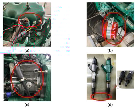 Most of the existing research results on the fault diagnosis of diesel engine equipment has studied the fault diagnosis method by pre-setting the fuel supply system fault of the diesel engine. As can be seen from the fault statistics of a type of self-propelled artillery diesel engine shown in Figure 5, the fuel supply system fault has the highest probability of occurring in the actual use of the diesel engine, reaching 27.0%. As shown in Figure 6, in the process of pre-setting the fault, the cylinder can be pre-set by disconnecting the cylinder ignition power line to pre-set the cylinder misfire fault, adding the air intake outer cover to pre-set the air filter blockage fault, replacing the injection pump fault parts to pre-set the injection pump fault leading to insufficient fuel supply (the internal gear of the injection pump wears out leading to low fuel supply pressure), and replacing the injector fault parts (the injector needle valve wears out) to pre-set the injector drip fault.