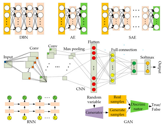 The advantages and disadvantages of typical deep learning models are summarized in Table 3, and the basic unit schematic is shown in Figure 7. Different deep learning models have different structures and characteristics, but they are all suitable for situations with large amounts of data and more complex tasks. Some models also have their own unique roles, for example, AE is suitable for extracting features, generating data, and noise reduction, RNN is good at processing time-series data; and GAN is suitable for semi-supervised, unsupervised generative tasks.