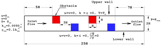 The investigation revolved around a heat exchanger. It has a horizontal, rectangular channel, an isothermal upper wall, a thermally insulated lower wall, and extended surfaces in the form of intermittently spaced-apart obstacles. Figure 1 presents a precise geometric illustration.