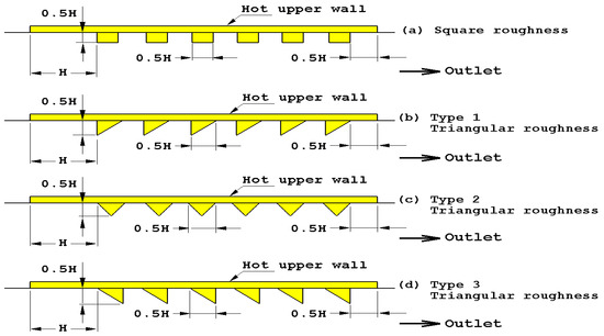 To improve the performance of the heat exchanger channel, rough walls were used in the presence of fins and triangular baffles. The third model, Figure 2c is compared to the performances of four channels in the presence of four roughness modes: square, Figure 3a, triangular Type 1, Figure 3b, triangular Type 2, Figure 3c, and triangular Type 3, Figure 3d. In all the cases proposed, the roughness is present only on the upper hot wall of the channel, exactly in line with the last obstacle.