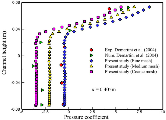 For the numerical simulations presented in this article, we refer to the experimental work of Demartini et al. [7], who studied planar baffles. Figure 4 shows our result and those obtained by Demartini et al. [7]. The three meshes tested (coarse: 97,593 nodes, medium: 215,897 nodes, and fine: 458,632 nodes) are illustrated in Figure 4. For turbulence models that use the wall functions equation, kε, the first cell is placed in the fully turbulent (log-law) region just after the buffer layer which satisfies the condition y+ ≈ 30. It depicts the pressure coefficient profiles with some previously studied numerical results for Uin = 7.8 m/s after the second chicane at x = 0.405 m. A good agreement between the numerical results, for fine mesh, and experimental results is observed, showing the growth of the pressure coefficient near the walls. The lower pressure values near the tip of the baffles are due to the high velocities in this region. Consequently, the fine mesh was chosen, despite the simulation being terminated due to excessive element distortion.
