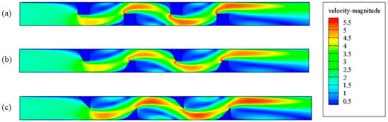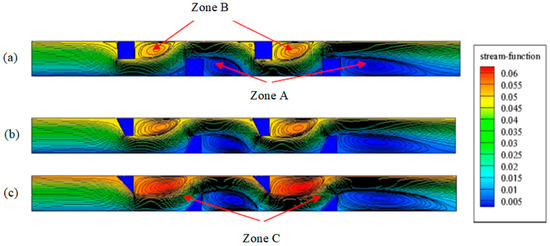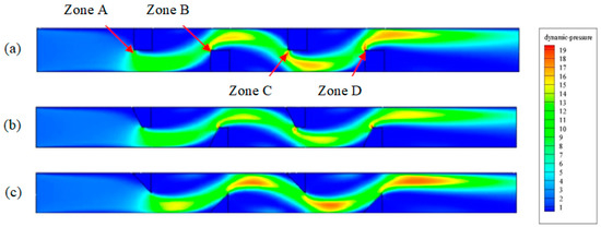 The dynamic pressure is uniform at the entrance, immediately below the first upper obstacle zone. Upstream of the upper and lower obstacles, the dynamic pressure approaches zero values. The zones (A, B, C, and D) with the highest dynamic pressure are separated by the sharp upstream edge. However, the flow separates from the obstacle’s wall, which results in a depression downwind of these obstacles. Due to the poor circulation at this location, the dynamic pressure at the attack terminals in Figure 6a is nearly negligible. The dynamic pressure in Figure 6b must be displaced along the profile, causing an average flow of kinetic energy. The pressure in Figure 6c has a substantial value since the profile is ideal, which allowed for a large movement.